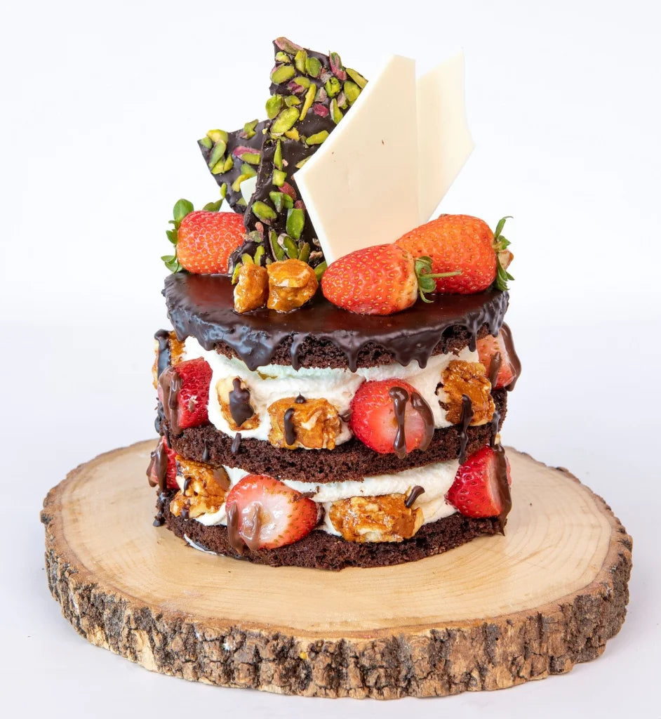 Devils Keki, Prenses Kreması, Akışkan Çikolata Krokan ve Çilekler.