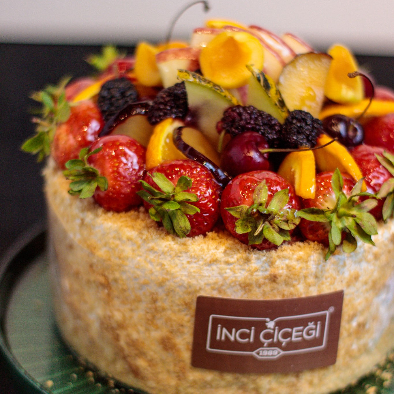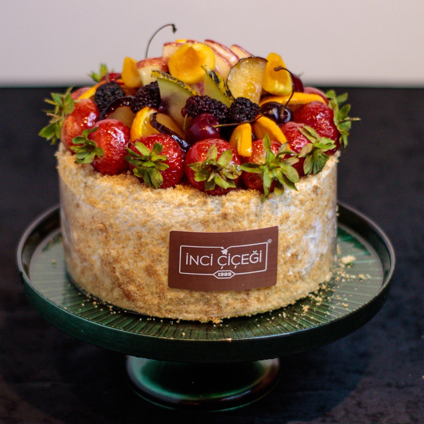 Vanilyalı Pandispanya, Sarı Pastacı Kreması, İçinde Muz ve Çilek Üstü Mevsimine Göre Karışık Meyveler