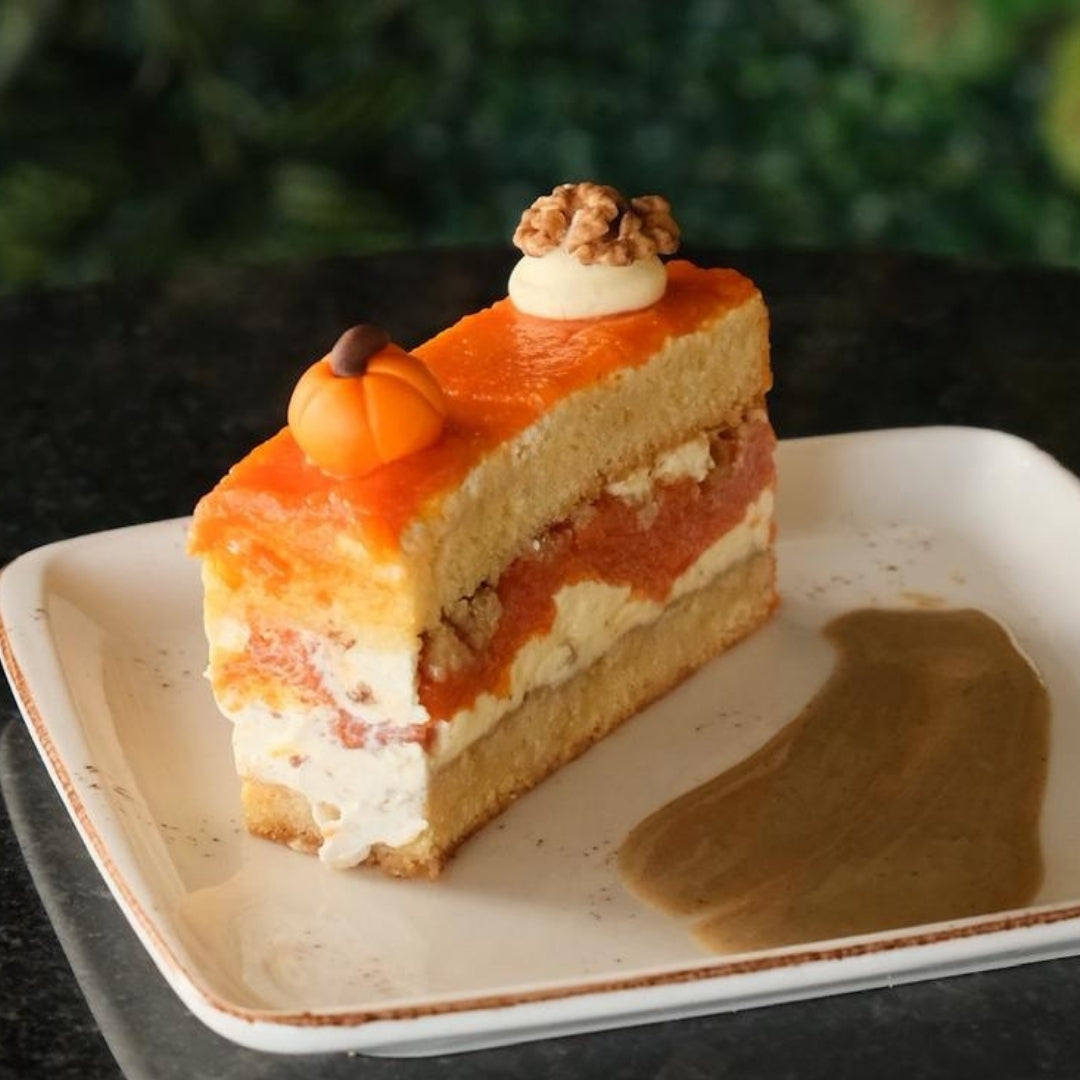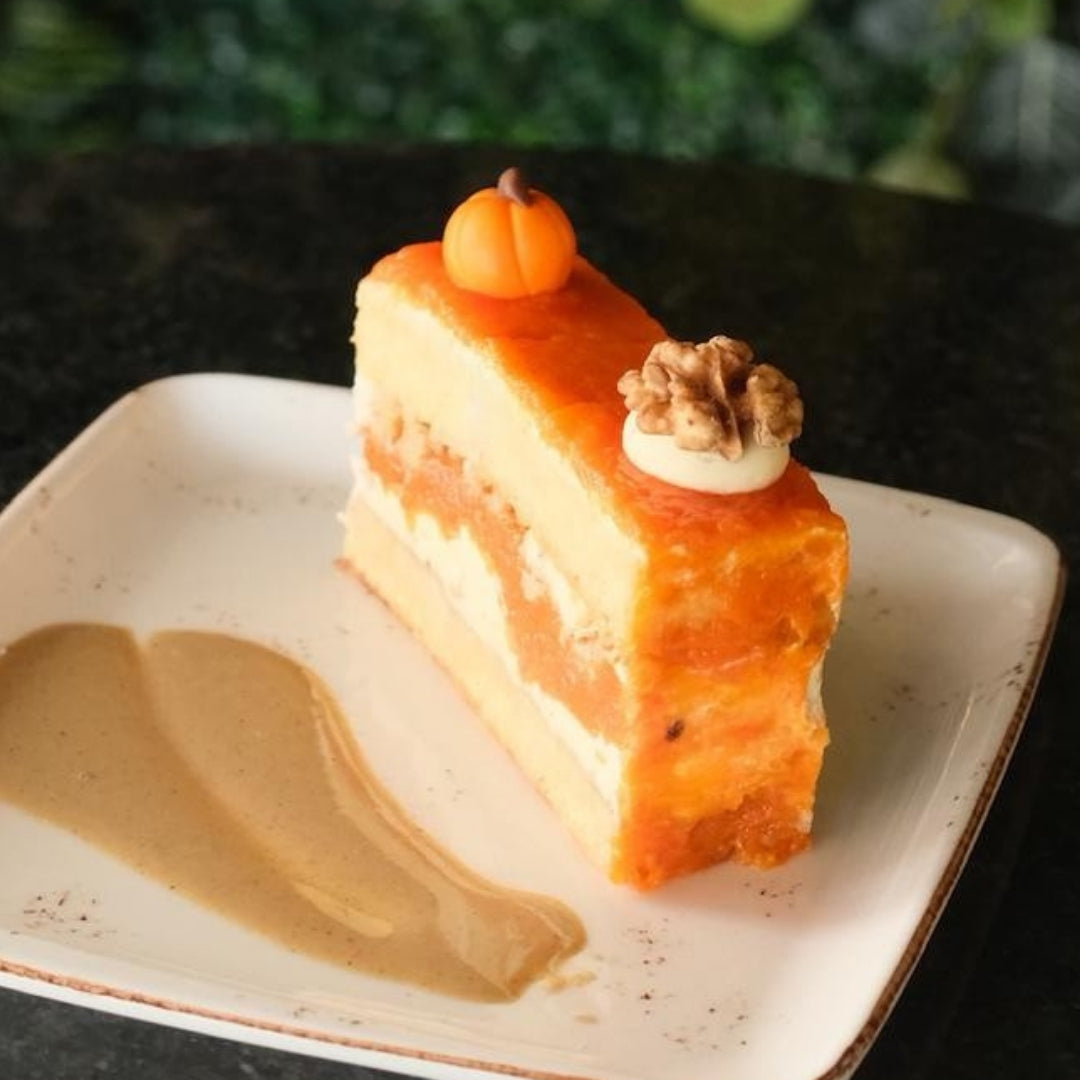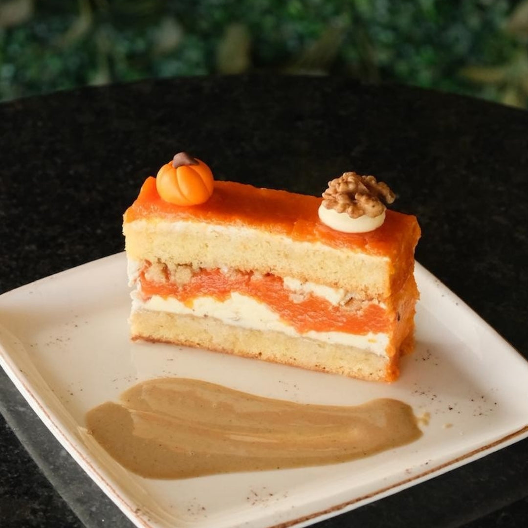 Vanilyalı Özel Moist Keki, Sarı Pastacı Kreması , Bal Kabağı, Tahin, Ceviz.