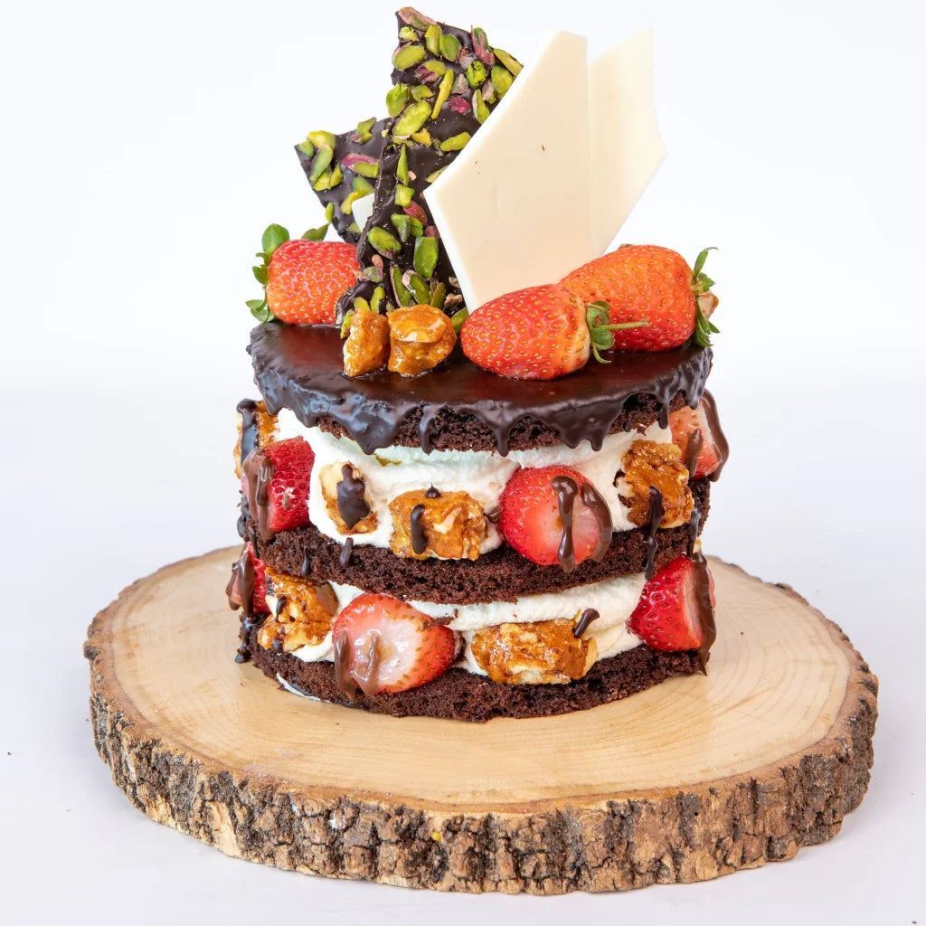 Devils Keki, Prenses Kreması, Akışkan Çikolata Krokan ve Çilekler.